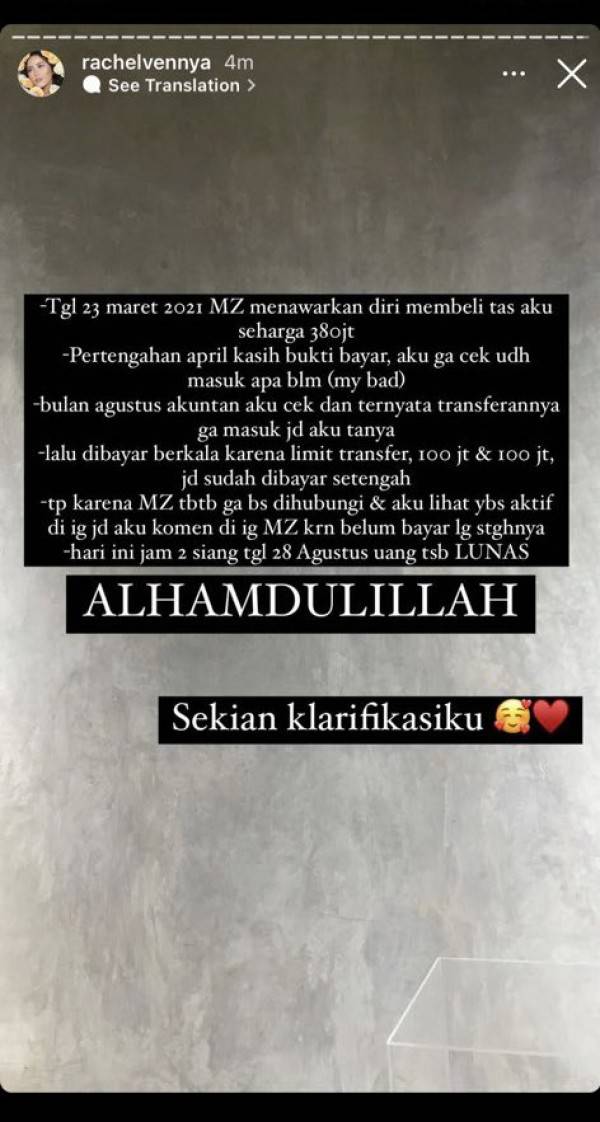 Masih di hari yang sama, atau pada sore hari, Rachel memberikan klarifikasi sekaligus kronologi singkat bagaimana Medina bisa memiliki utang dengannya. Rachel menuliskan bahwa pada 23 Maret 2021, Medina membeli tas miliknya dengan harga Rp380 juta. Medina memberikan bukti transfer pada pertengahan April 2021 dan Rachel percaya bahwa Medina telah membayar tasnya tanpa mengecek mutasi rekeningnya terlebih dulu.