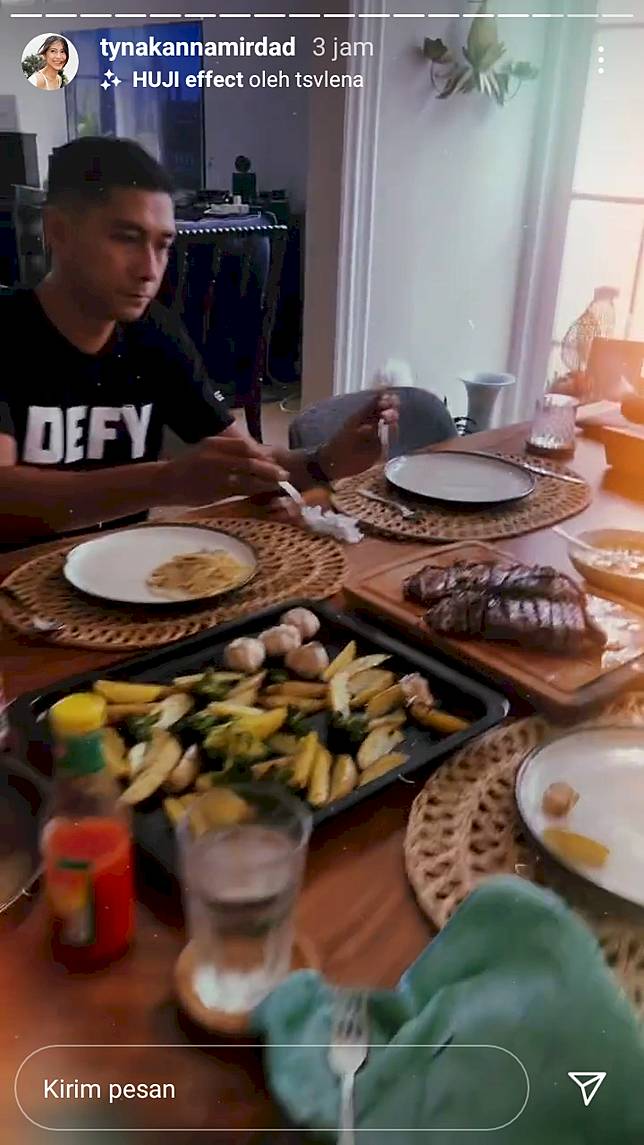 Dalam video story tersebut, Kenang Mirdad terlihat mengenakan kaos warna hitam yang tengah duduk di meja makan. Sementara disampingnya ada kursi dan piring kosong yang diduga disediakan Tyna untuk dirinya.